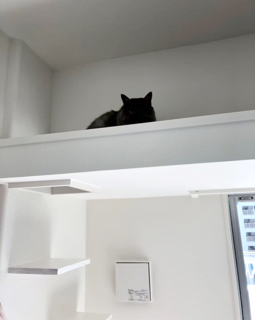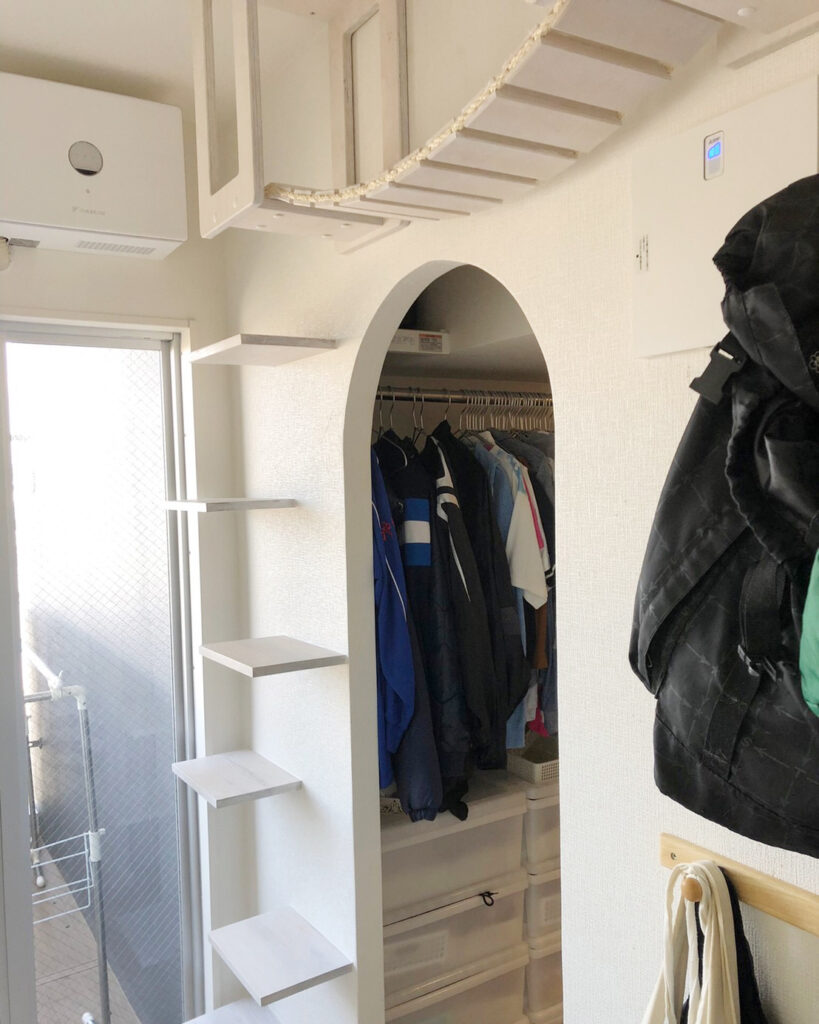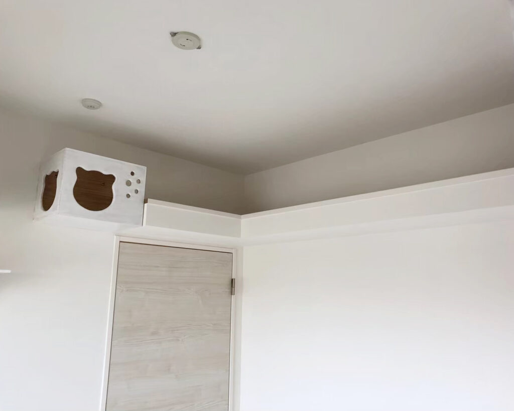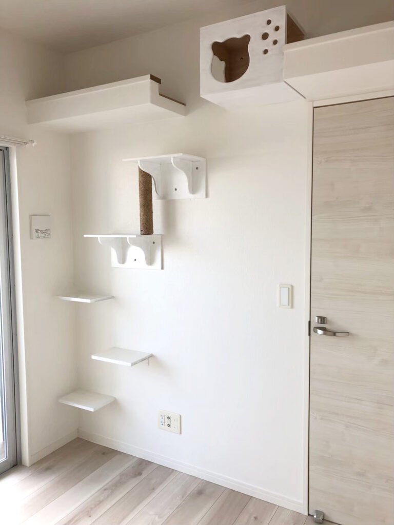 こちらのお部屋のキャットウォークはL型にして、反対の壁にもキャットボックスを付けています。