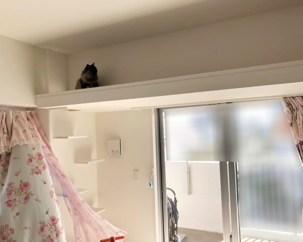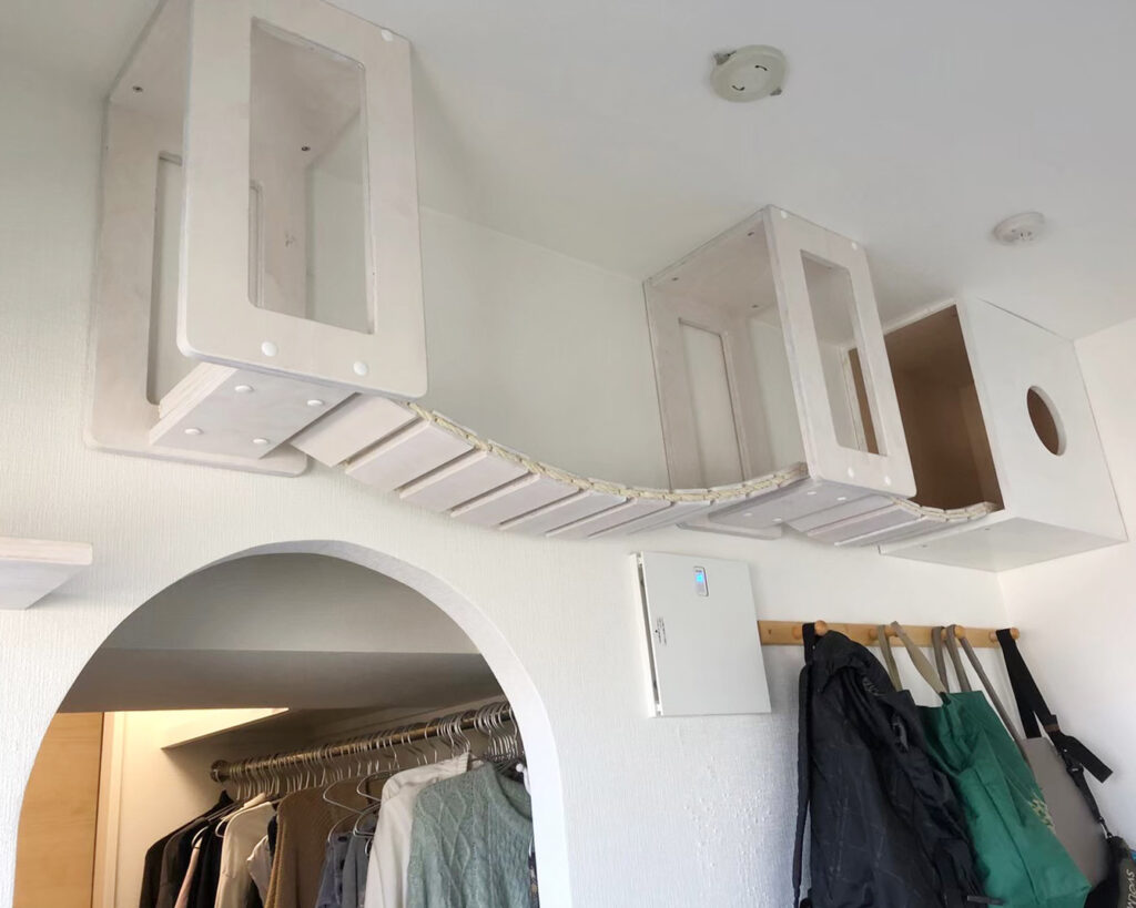 それぞれが落ち着けるように空間を分けてあげたいとご相談いただき、リビングにキャットウォークとキャットステップ。洋室2部屋にキャットステップと元々お持ちだったキャットボックス、ドイツ製のブリッジを取付けました。