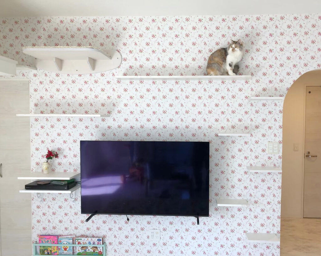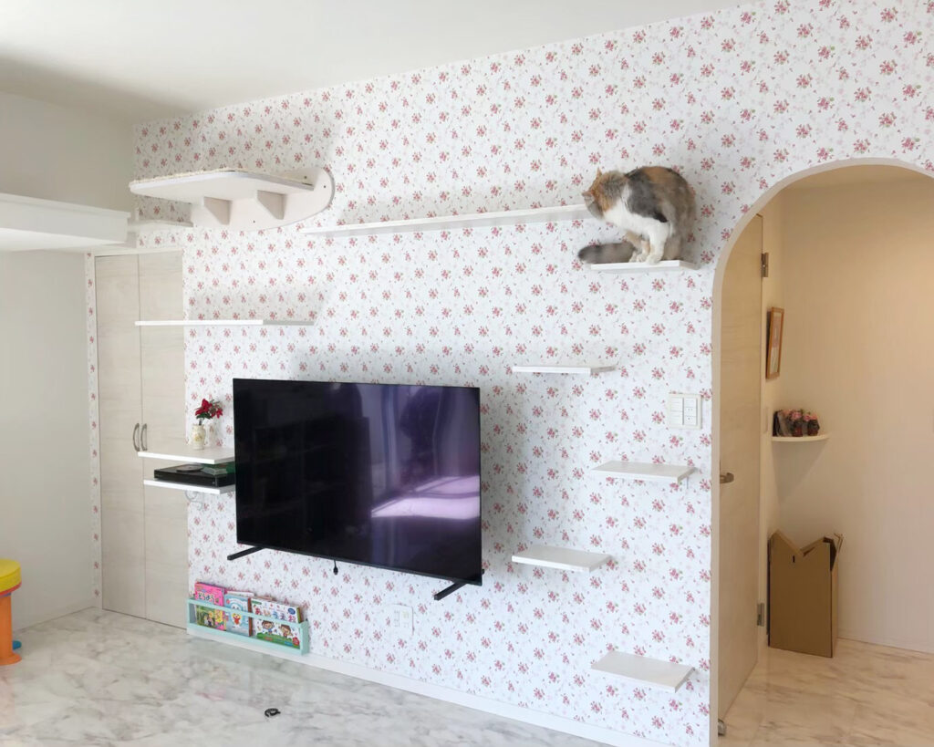 テレビを置く壁面にもキャットステップとドイツ製のラウンジボードを。ロココテイストのインテリアがお好きな奥さまと一緒に、たくさんの壁紙の中からチョイスしたアクセントクロス。