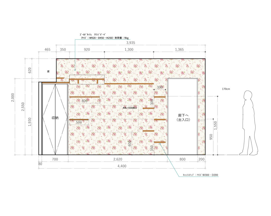 距離が長く取れることと梁も隠せるので、こちらの壁面にキャットウォークを。