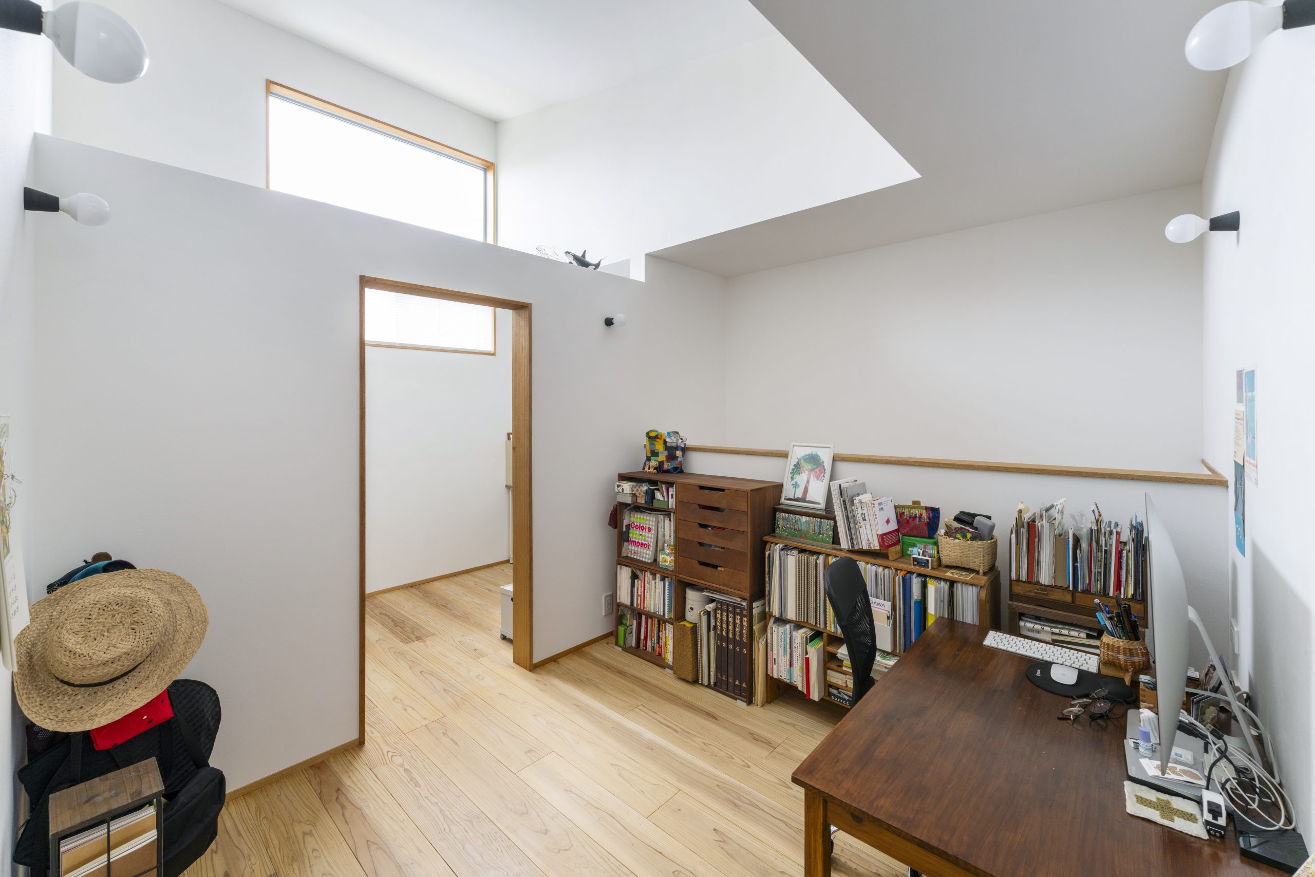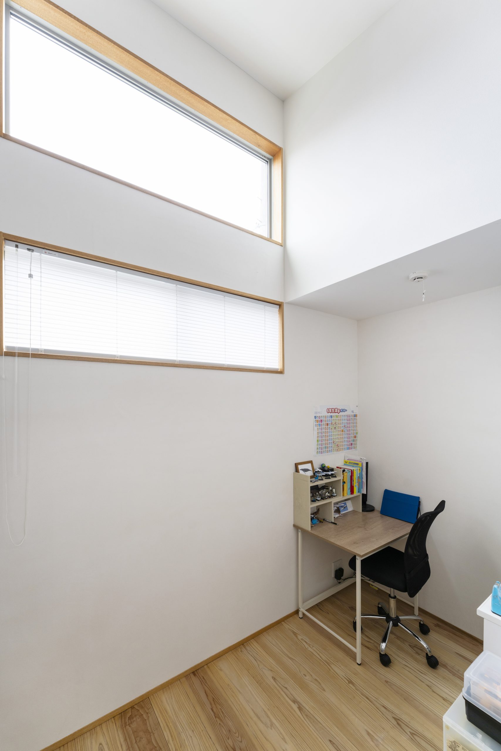 ゆくゆくは子ども部屋にはドアが付けられるようにして、今は奥さまのワークスペースとつなげることでうまく間取りがはまりました。ご主人は遅くまで仕事をするため個室に。