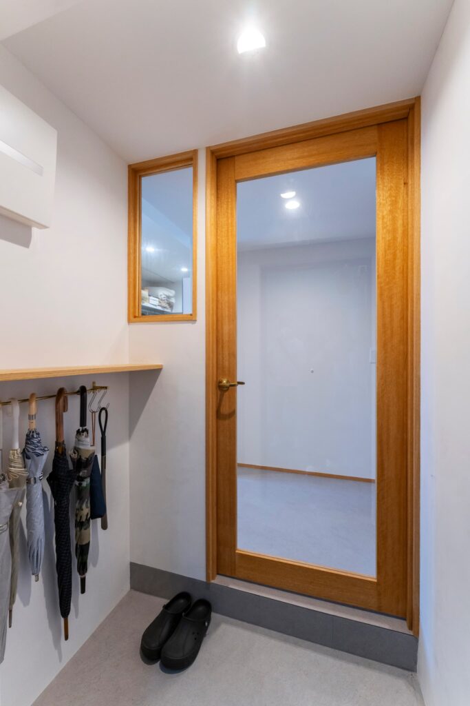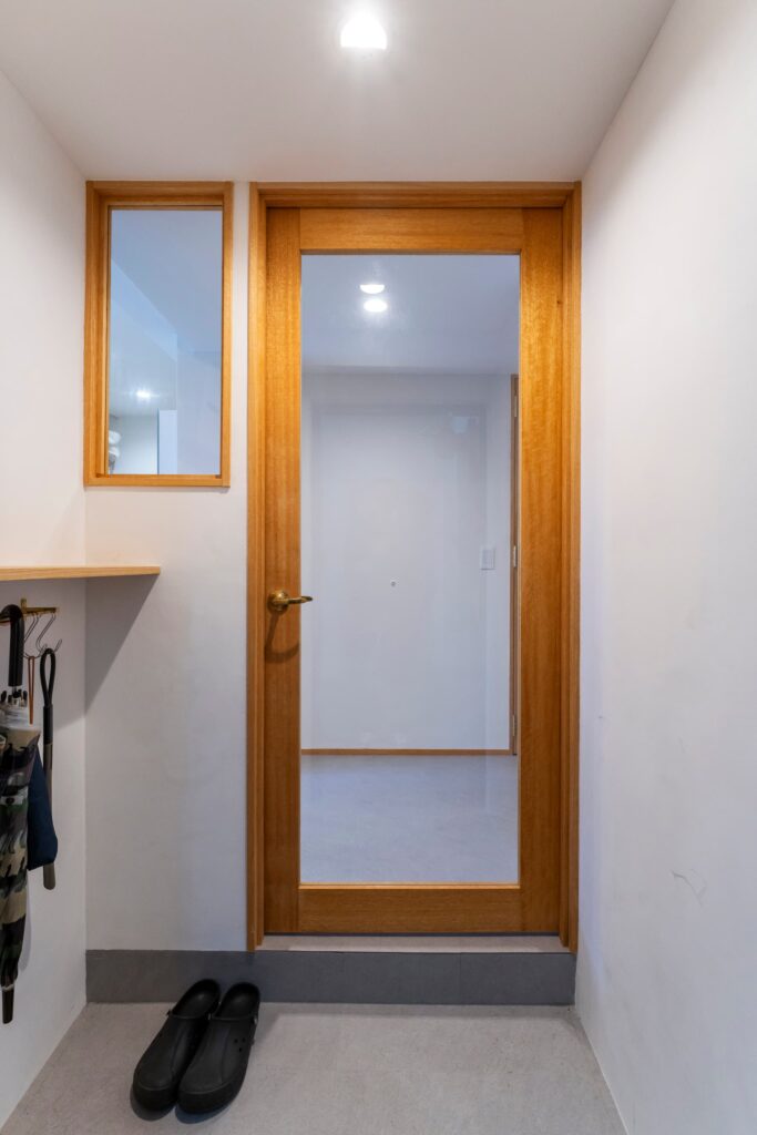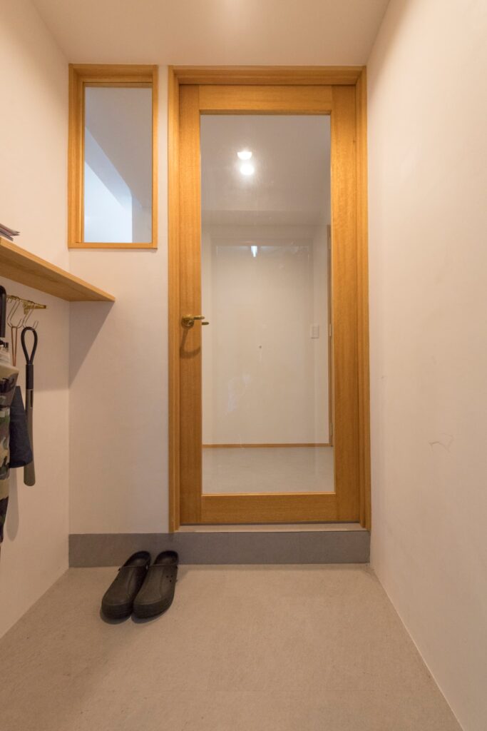玄関ドアもポストの無いものに交換して、ねこちゃんの脱走防止ドアも設置して、断熱効果を高めました。防犯面も強化したくて玄関ドアはダブルロックに。
